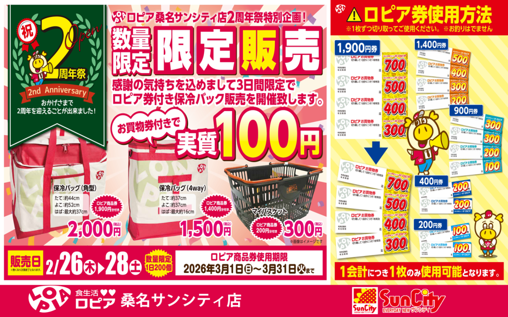 2月26日~28日数量限定1日200個ロピア券付き保冷バック販売お買い物は、ぜひロピアへ🎈詳しくはInstagram@lopia.kuwanasuncity_officialロピア桑名サンシティ店電話0594-33-0298