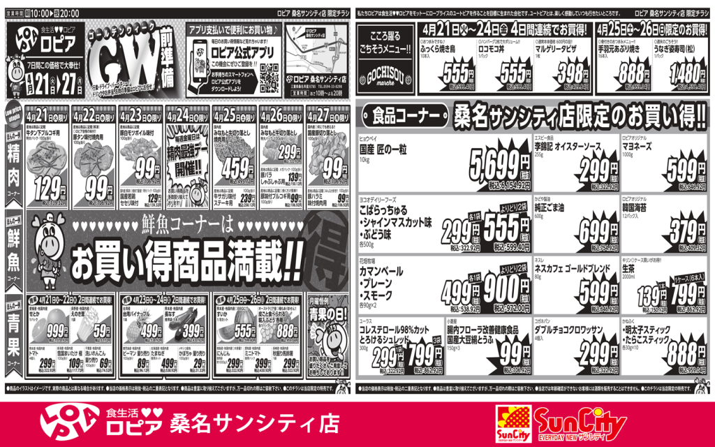 ロピア桑名サンシティ店4月21日~4月27日ゴールデンウィーク前準備詳しくはInstagram@lopia.kuwanasuncity_officialロピア桑名サンシティ店電話0594-33-0298